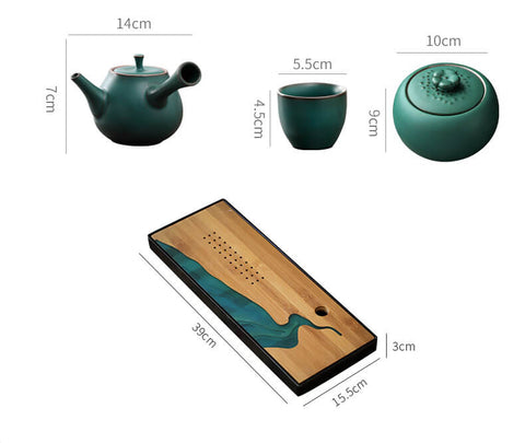 - Size - teapot dxh=4.7"x5.3" (14cmx7cm); tea cup dxh=2.2"x1.8" (5.5cmx4.5cm); tea canister dxh=3.9"x3.5" (10cmx9cm); tea tray axbxh=15.4"x2.0"x1.2" (39cmx5cmx3cm).